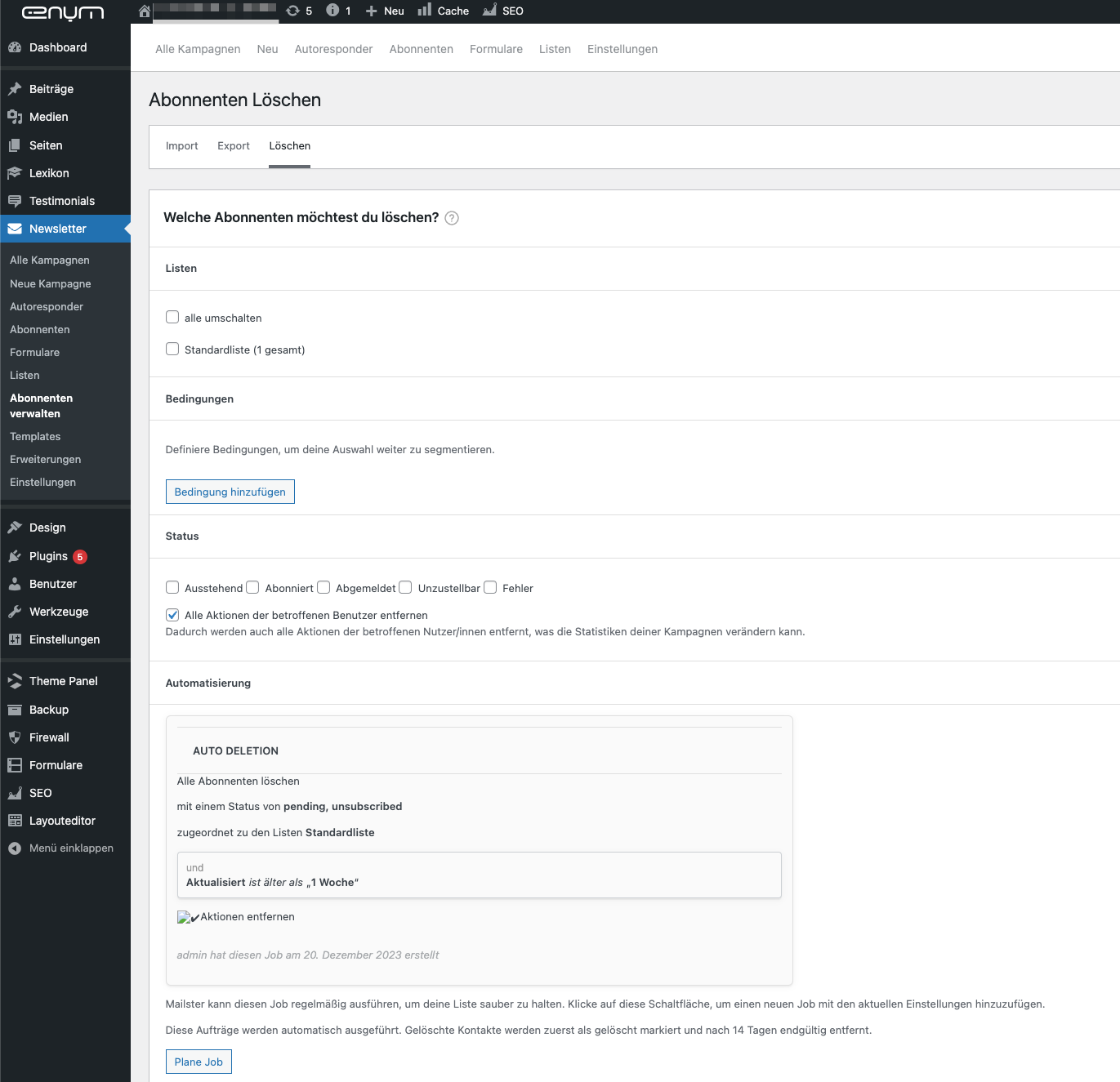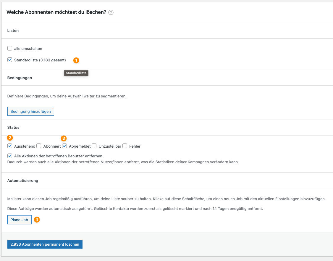 Set the condition to: „Updated“ „older than“ „1 week“. This means only select subscribers who did not confirm the subscription or ar longer than one week unsubscribed.