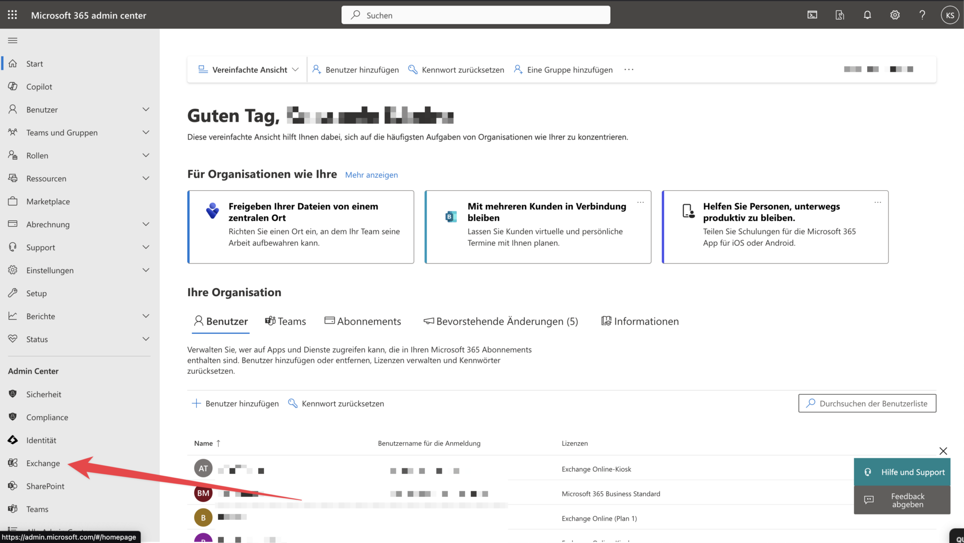 Im Admin-Center auf Exchange klicken, um zum EAC zu gelangen: