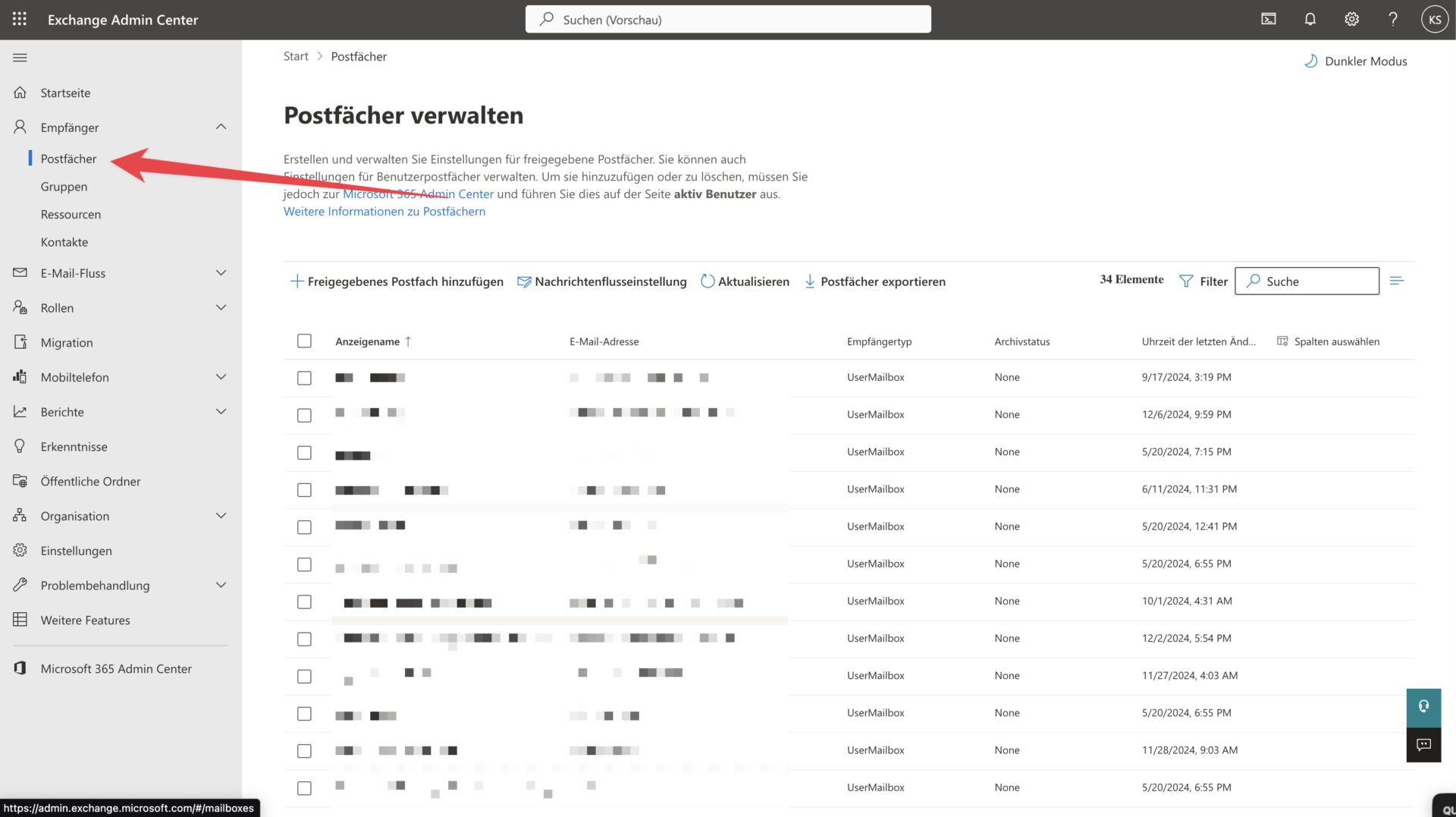 Im EAC auf „Empfänger“ – Postfächer klicken: