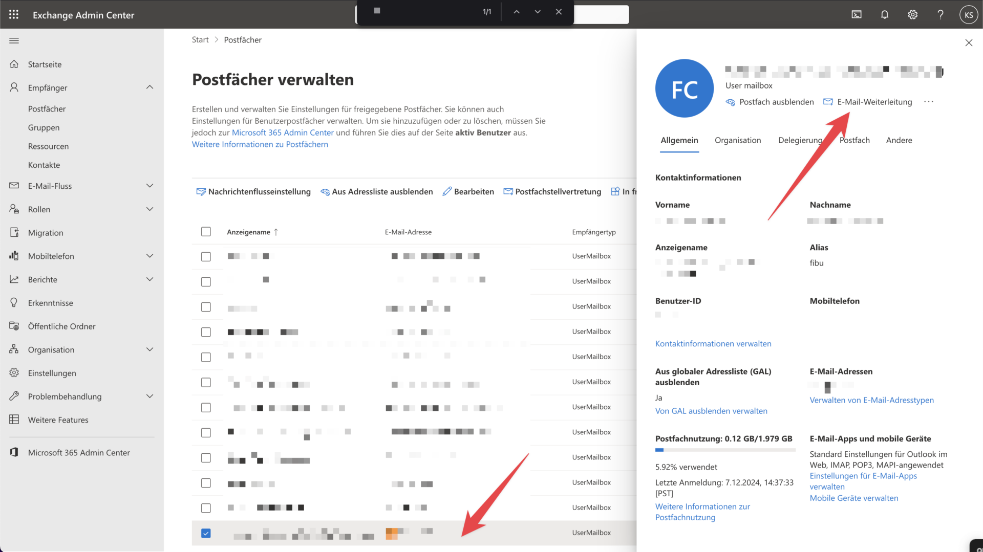 Die gewünschte Mailbox anklicken und oben rechts auf Weiterleitung klicken:
