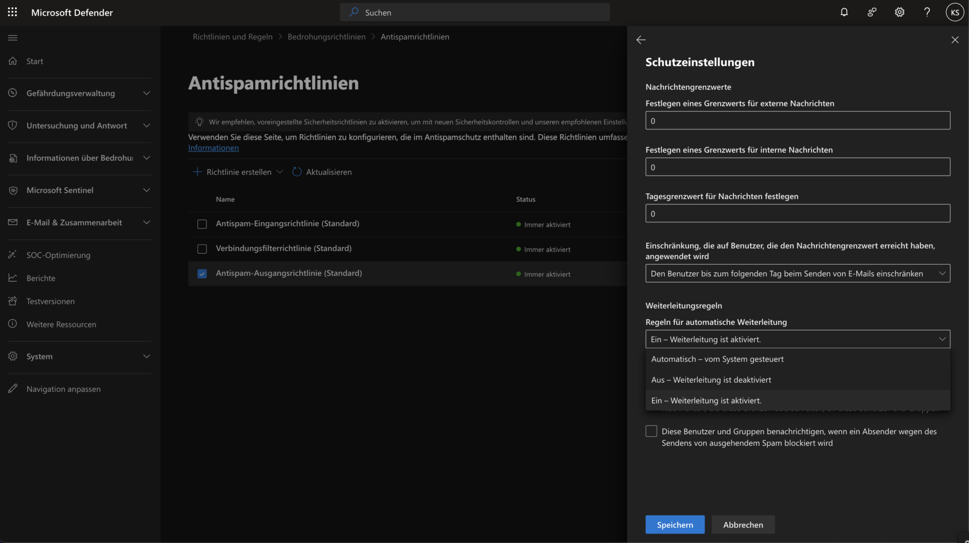 Wenn eine Weiterleitung an externe Postfächer aktiviert werden soll, dann muss das in den Spam-Einstellungen vorher erst noch dediziert aktiviert werden: