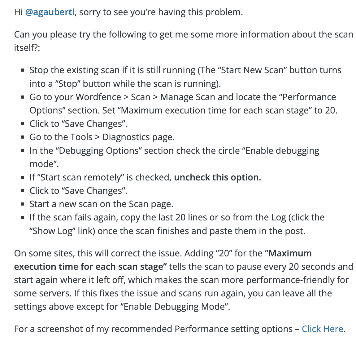 - Go to your Wordfence > Scan > Manage Scan and locate the “Performance Options” section. Set “Maximum execution time for each scan stage” to 20.